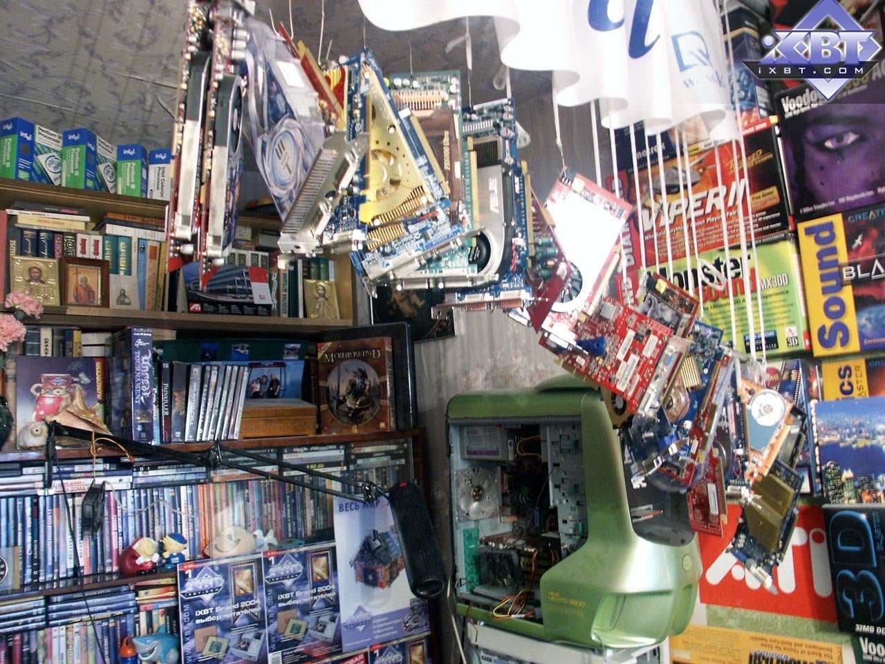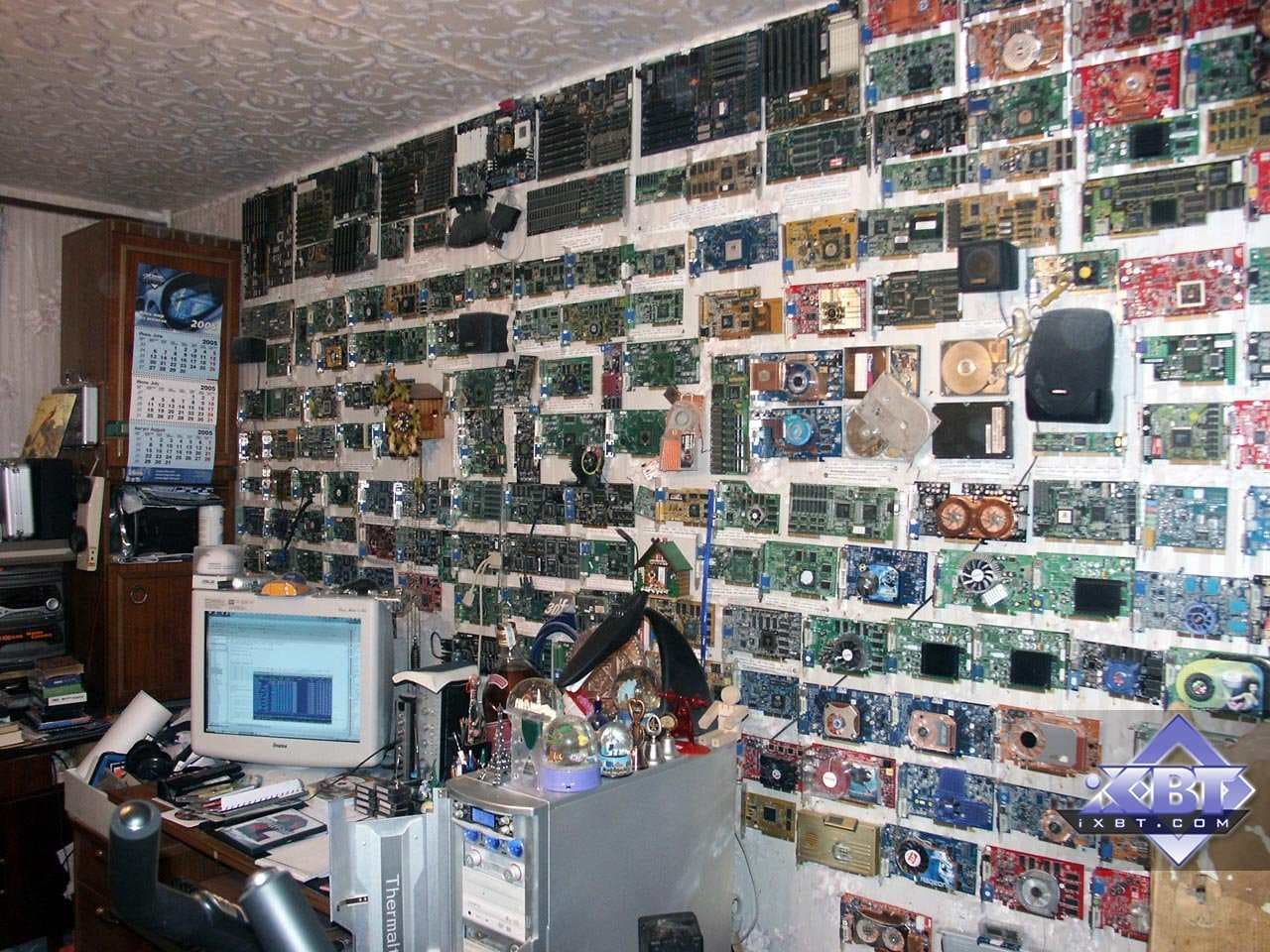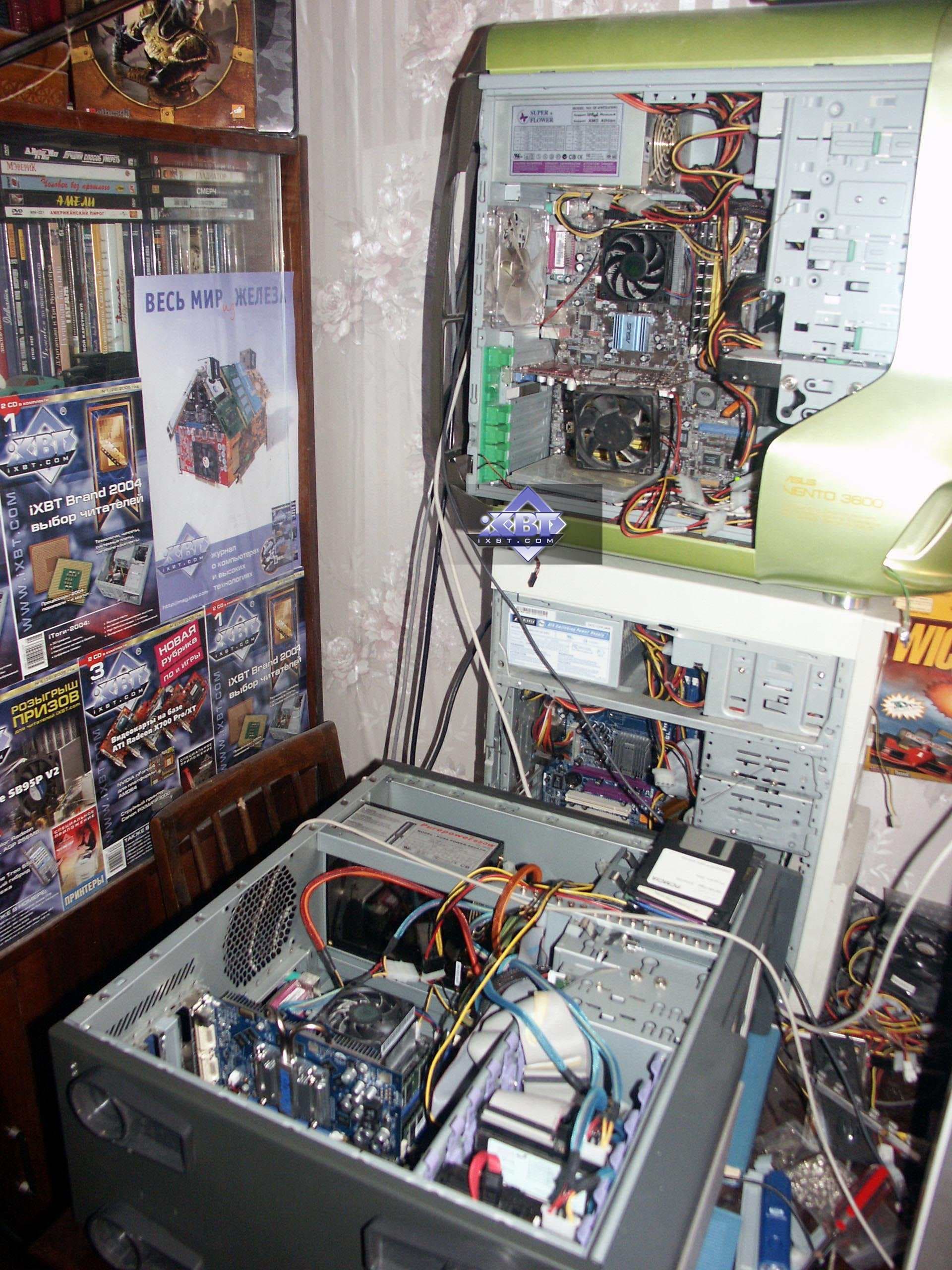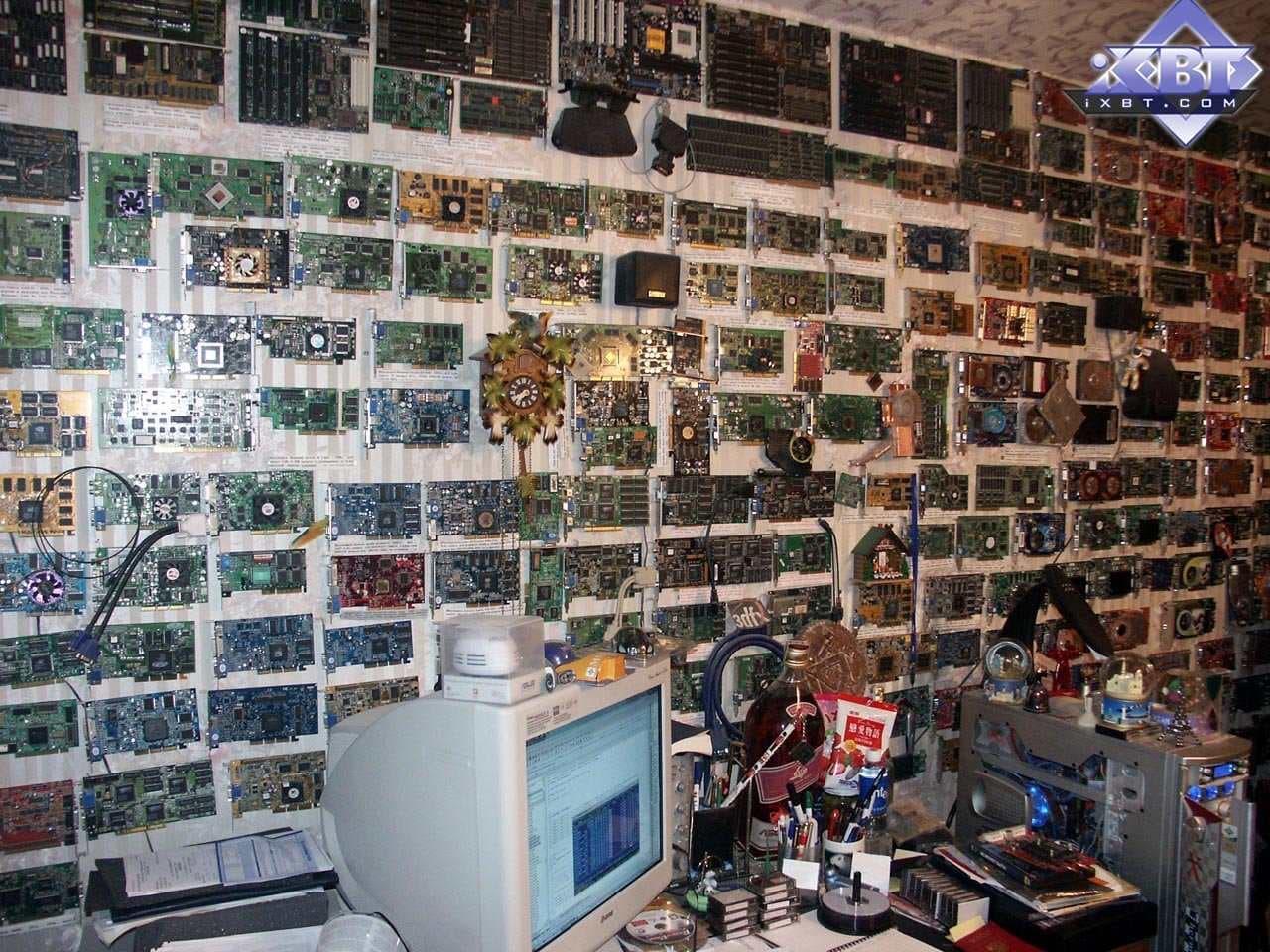 Надо сказать, что некто tim, а именно самый высокий из всей команды (потому он взял себе ник smalltim :-) ), впоследствии стал ведущим редактором по видеосистеме на Ф-Центре и xbitlabs.com, а сейчас он работает в NVIDIA инженером. Его модифицированная карта Savage 2000 (где увеличено напряжение на чипе и памяти) до сих пор находится у нас в музее, и даже одно время принимала участие в сводных тестированиях видеокарт прежних выпусков (когда еще хоть какие-то игры работали на таких платах). Ее можно увидеть на первой фотографии (из представленных ниже) — чуть правее и ниже от часов с кукушкой (у платы на чипах памяти установлены радиаторы, на них еще есть отпечатки пальцев самого smalltim-а :-) ).