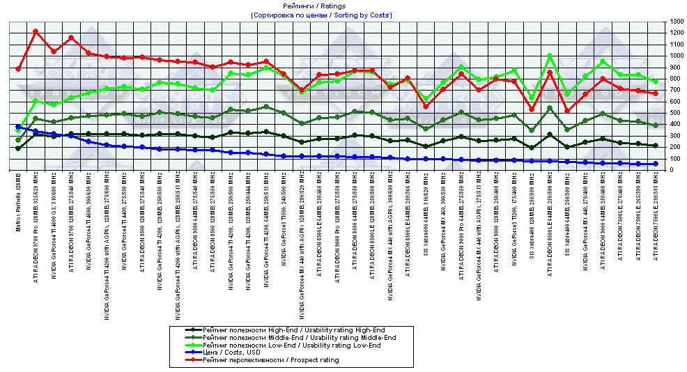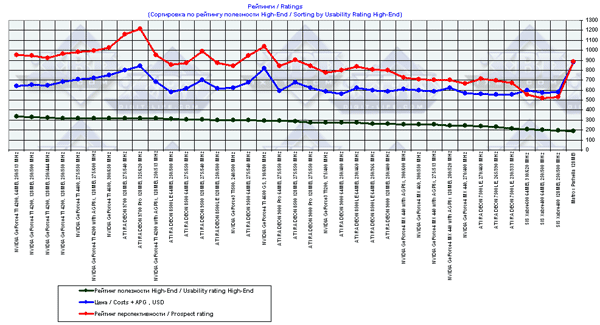 - Рейтинги полезности разбиты на три категории: High-End, Middle-End и Low-End. Каждый из этих рейтингов подразумевает свои затраты на сопутствующий апгрейд системного блока. Это зафиксировано в параметре APG, который равен 100 для Low-End, 250 — для Middle-End, 500 — для High-End. Мы полагаем, что если кто захочет купить очень дорогую и мощную карту, то он должен понимать, что ставить такую карту в слабый с точки зрения CPU, объема ОЗУ и т.п. компьютер — бессмысленно, поэтому мы ввели три рейтинга полезности для разных ценовых "весов" компьютерных системных блоков.