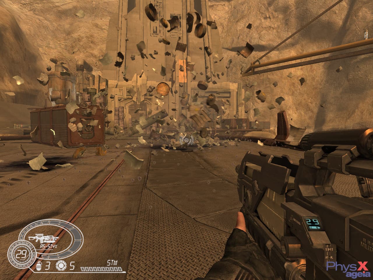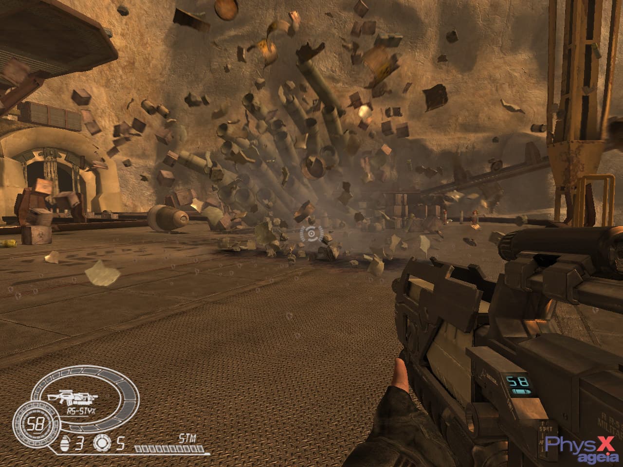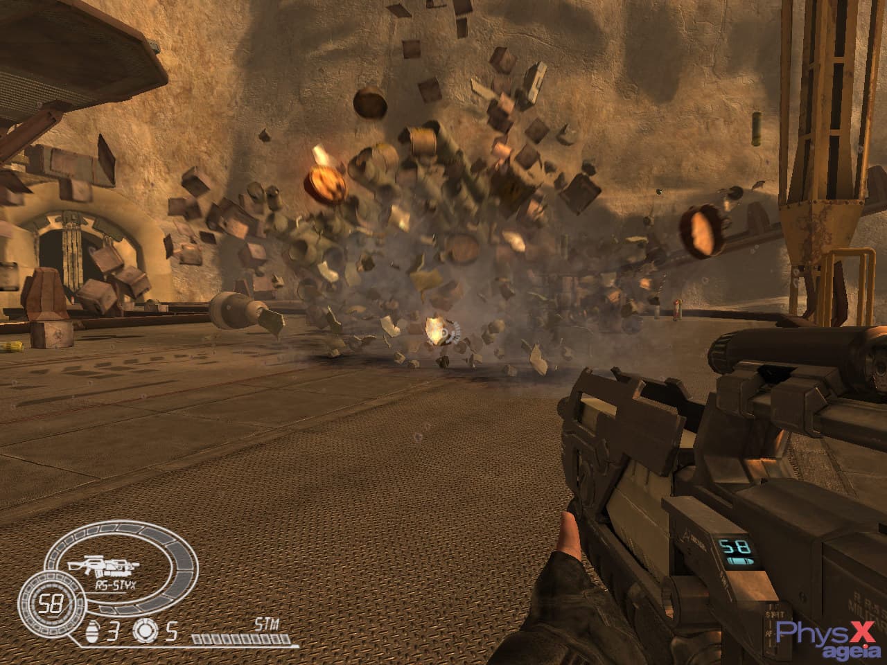 На примере CellFactor хорошо прослеживается практическое доказательство нашего теоретического предположения о том, что PPU — это в первую очередь количественное улучшение уже виденных нами физических эффектов. В 2003-м году в Max Payne 2 с полок падало на пол по 5 коробок, а тут — летает по 500 ящиков одновременно.