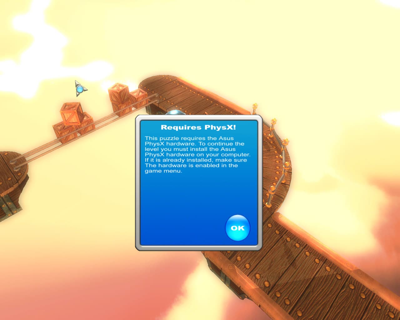Switchball позволяет отключать использование аппаратной физики в своих настройках, однако попытка поиграть в него после этой операции оборачивается вот такими сообщениями: