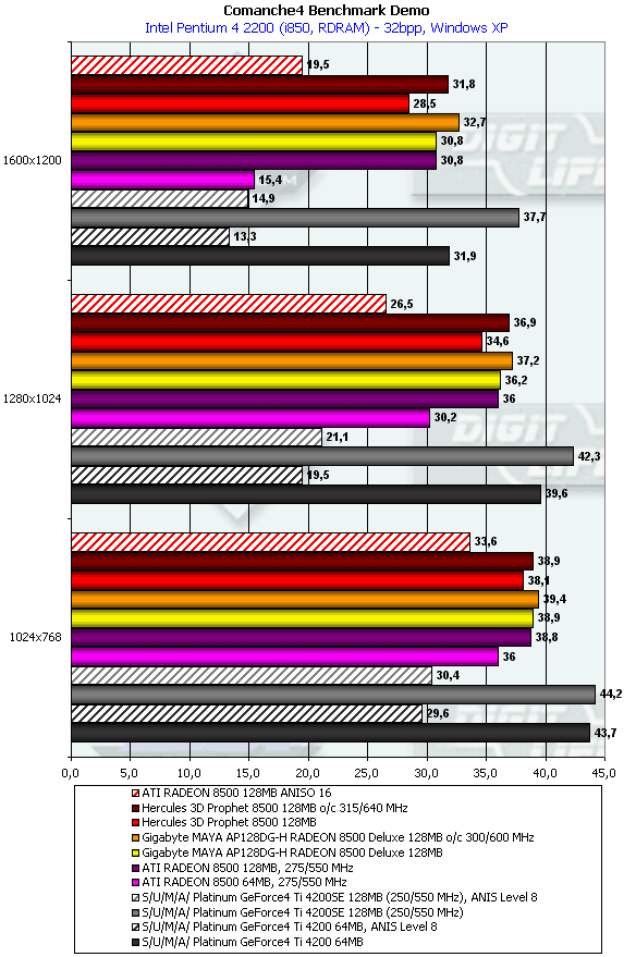 Да, мы везде выше говорили о том, что анизотропия у RADEON 8500 обладает очень важным преимуществом — относительно мало "пожирает" производительность. Чего не скажешь про подобную функцию у карт от NVIDIA.