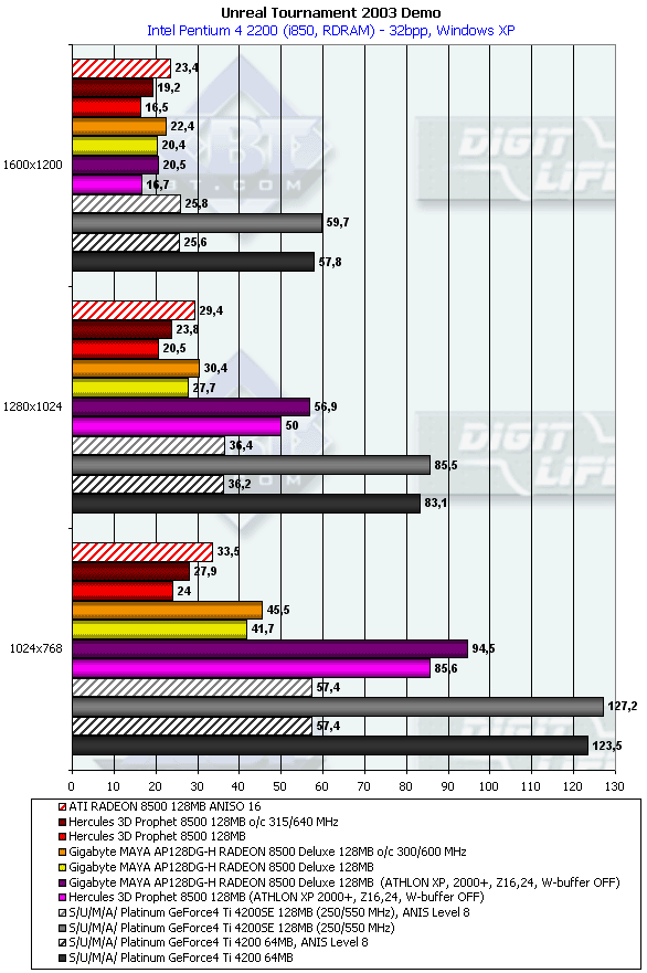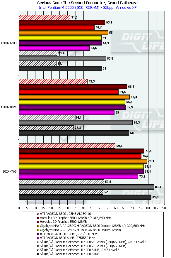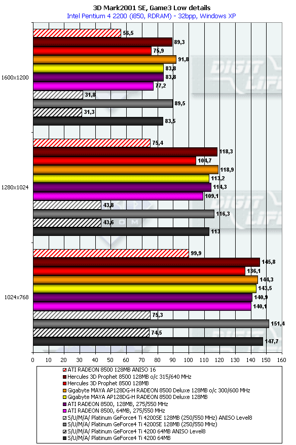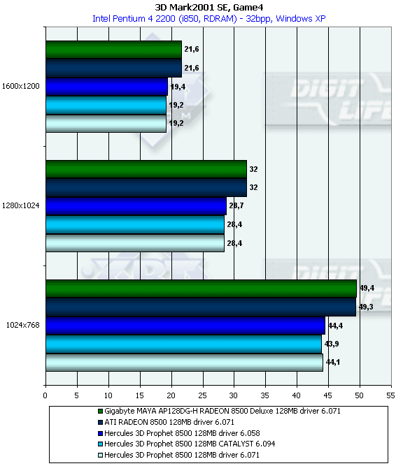 Разница в производительности между самими видеокартами на базе RADEON 8500 в данном тесте уже меньше, но она все же имеется.