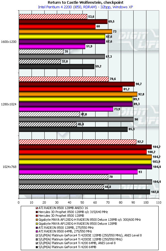 - Return to Castle Wolfenstein (MultiPlayer) (id Software/Activision) — OpenGL, мультитекстурирование, Checkpoint-demo, настройки тестирования — все на максимально возможном уровне, S3TC OFF, конфигурации можно скачать тут