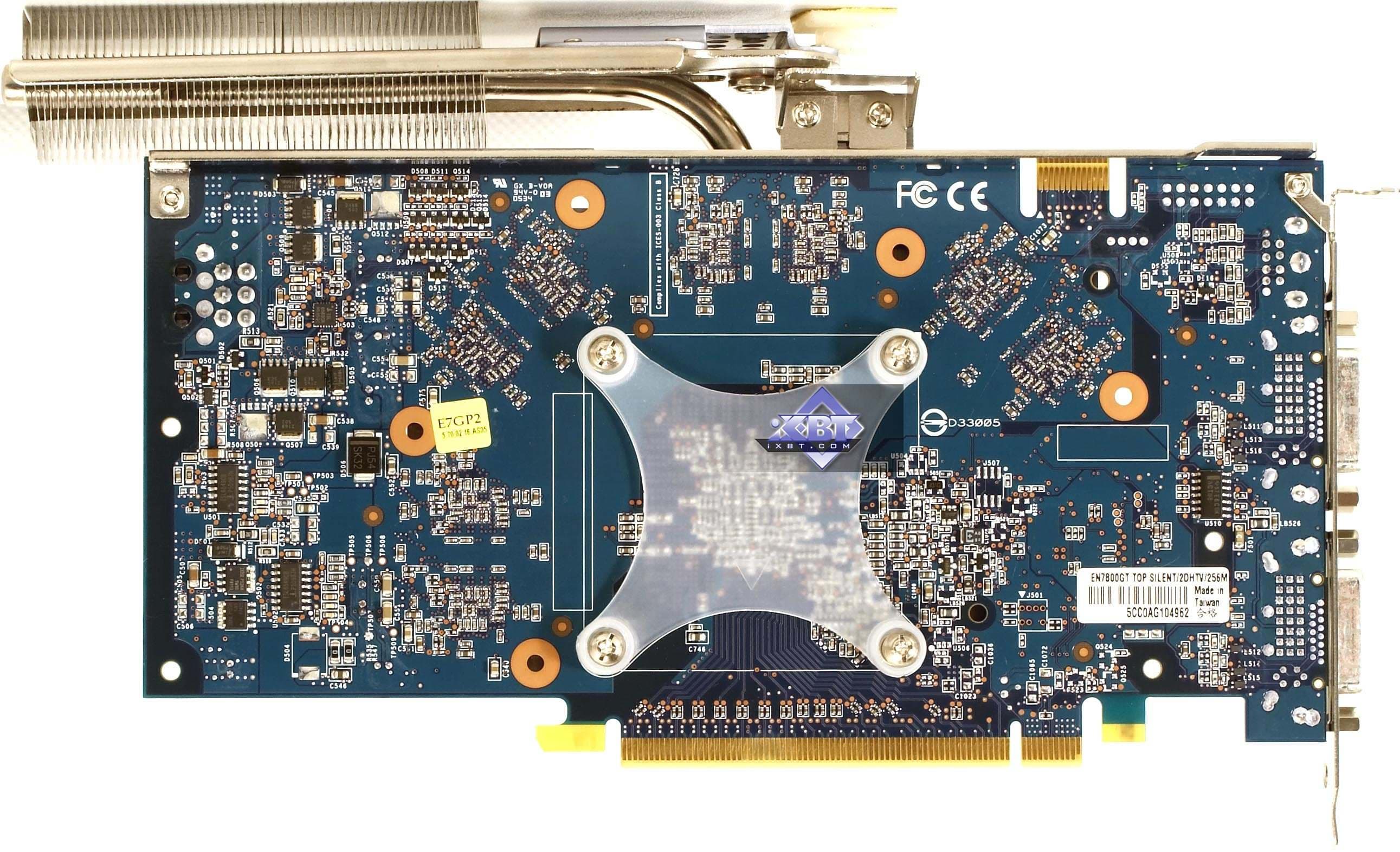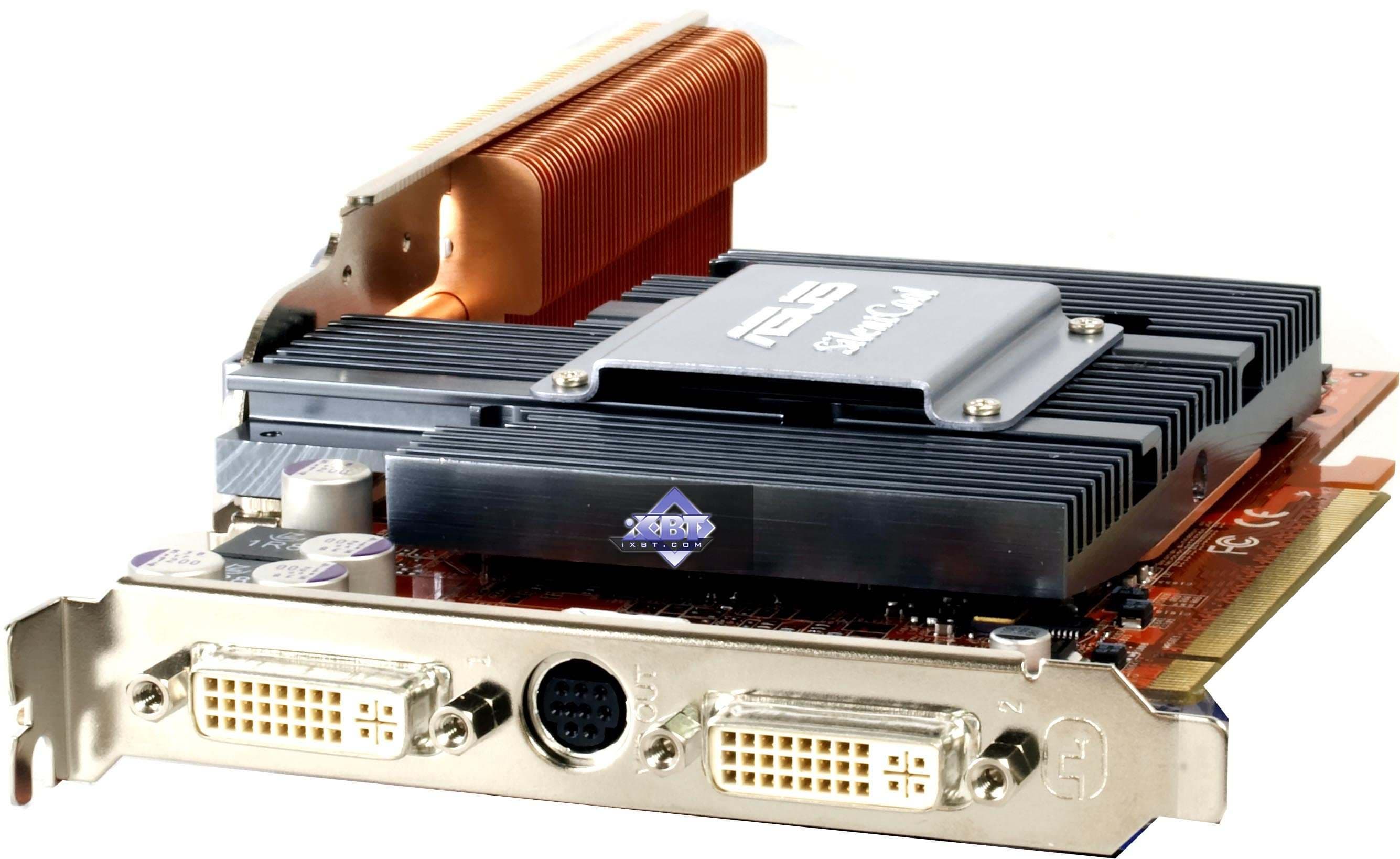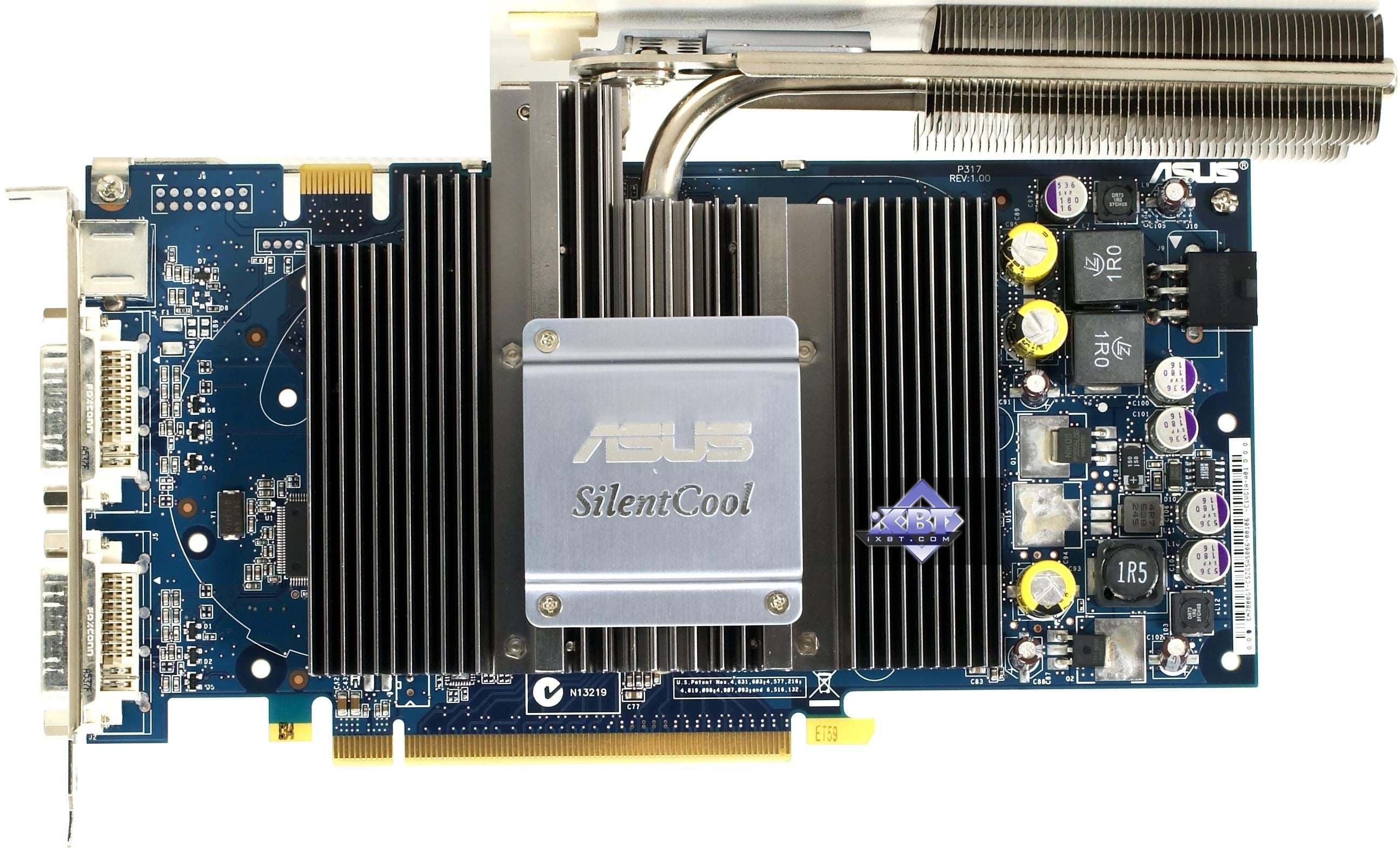 - ASUS Extreme N7800GT TOP Silent 256MB PCI-E — очень интересное решение с точки зрения подачи пользователям очень мощного ускорителя и с бесшумной системой охлаждения, однако все же небесспорное с точки зрения нагрева ядра. Все же он очень критичен, даже не для самой карты или чипа, а для окружающих карту компонентов внутри системного блока, ведь радиатор раскаляется также под 80-90 градусов. Поэтому такую карту можно ставить только в хорошо продуваемые корпуса! Качество в 2D отличное, нареканий на работу нет (даже при таком нагреве). И надо еще раз отметить как особую изюминку у карты — повышенные частоты работы, что выделяет ее среди прочих 7800GT.
