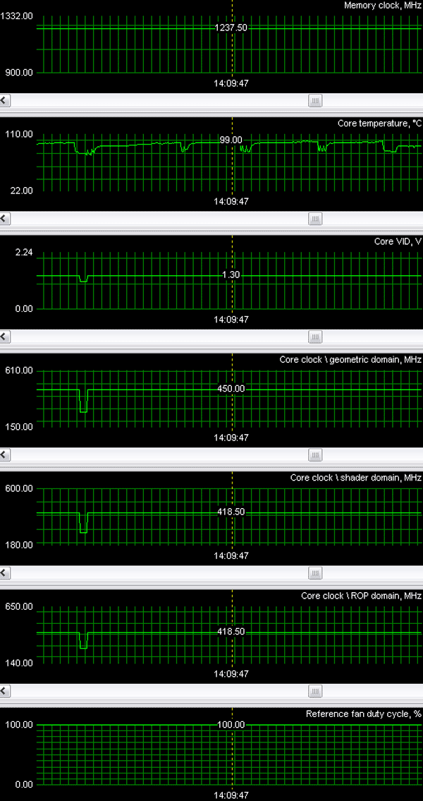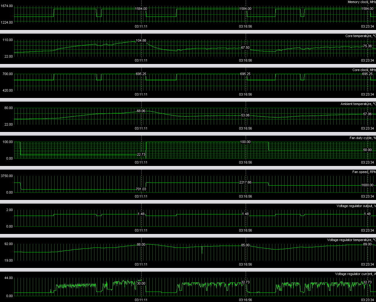 Первая слева вертикальная метка показывает пик температуры на ядре при минимальных оборотах кулера, она зашкалила за 100 градусов! После того, как частоту вращения кулера поставили на 100%, даже самая сильная трехмерная загрузка карты не поднимала температуру ядра выше 70 градусов. Поэтому было принято решение поставить обороты вентилятора на уровень 60%, и при этом температура ядра не поднимается выше 75 градусов, и кулер работает очень тихо.
