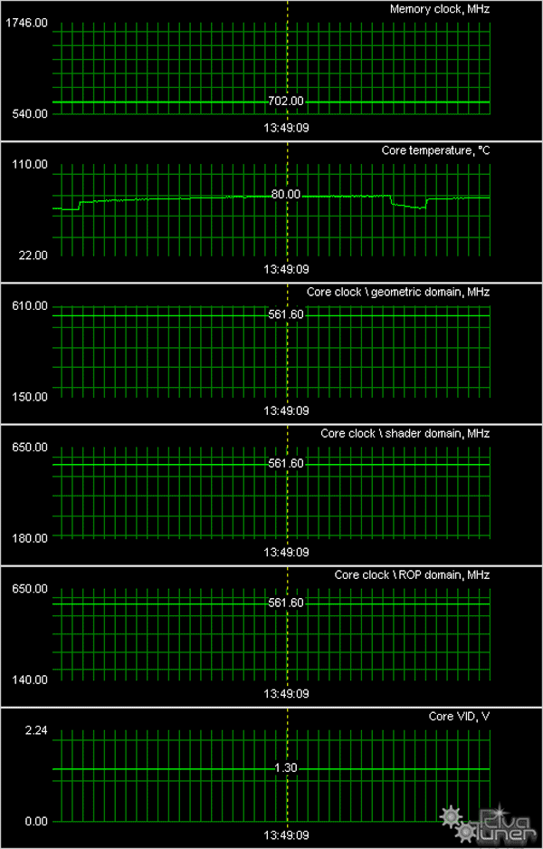 С помощью RivaTuner мы исследовали нагрев 7600 GT (условия описаны выше). Температура на ядре достигла 80 градусов. Учитывая, что карта дополнительно не обдувалась, и все функционировало в закрытом корпусе, это очень хороший результат. Для самой карты. А как для внутреннего состояния системного блока — еще вопрос. В моем случае температура внутри повысилась на 10 градусов. Так что, нужен хорошо продуваемый корпус.