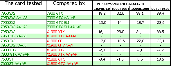 Да, подчас бывает, что X1900 XTX догоняет и даже обходит новинку от NVIDIA, однако это наблюдается в случаях, когда производительность упирается уже в системные ресурсы. А там результат непредсказуем. Тандем X1900 XT CF оказался более скоростным, но и цена у двух X1900 XT (CFE) намного выше.