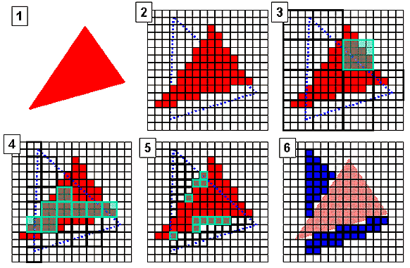 У нас есть уже закрашенный полигон (1), расположенный близко к наблюдателю. Мы хотим закрасить полигон (2), расположенный дальше и, соответственно, частично перекрытый. Вначале мы проводим поиск на самом верхнем уровне иерархического буфера глубины, на котором хранятся расстояния до самых больших блоков 4х4, и сразу выделяем блок, полностью принадлежащий верхнему треугольнику (3) и, следовательно, не нуждающийся в закраске. Таким образом, мы сразу отбрасываем необходимость закрашивать 16 точек. Затем мы переходим на более низкий уровень иерархии и отбрасываем еще 8 блоков 2х2. И на последнем уровне, детализированном до единичного пиксела, мы определяем еще несколько закрытых точек, которые не надо закрашивать. Разумеется, эта иллюстрация несколько схематична, но достаточна для понимания вычислительной выгоды и принципа работы иерархического буфера глубины.