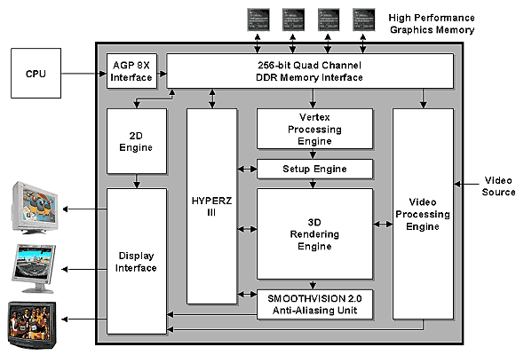- Четырехканальный (4 канала по 64 бита) контроллер памяти, связанный с ядром ускорителя и AGP коммутатором "каждый-с-каждым";