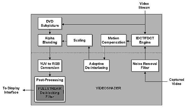 - Аппаратное ускорение распаковки и сжатия MPEG 1/2, возможность произвольно обрабатывать видеопоток с помощью пиксельных шейдеров (технология VIDEOSHADER);