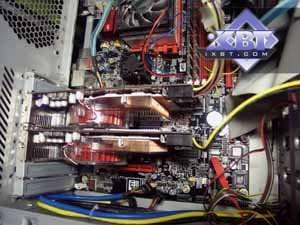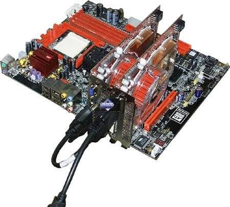 Обе карты объединяются в CF при помощи специального адаптера (его можно видеть на снимке выше). Так называемая мастер-карта вместо одного DVI гнезда имеет специальный разъем для подключения этого адаптера. Два других его конца подключаются, соответственно, к другой (слейв) карте и к монитору (на хвосте разъем DVI).