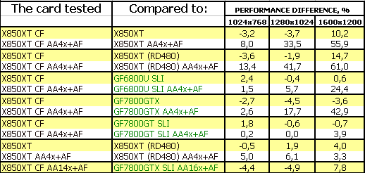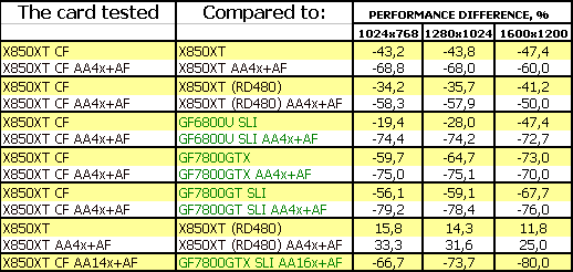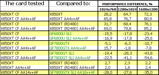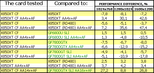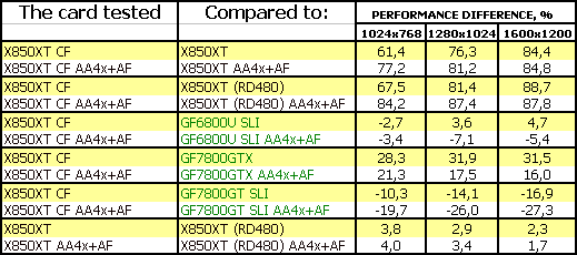 Прекрасный результат у CF! Приросты очень хороши относительно одиночного X850XT. Победа над 6800U SLI, 7800GTX. И лишь 7800GT SLI оказался выше.