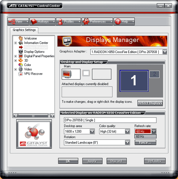 Теперь еще один грустный момент. Если подключать монитор к Мастер-карте через CF-адаптер (неважно, подключена вторая карта или нет), то мы видим очень неприятную картину для владельцев больших CRT-мониторов: работать в 1600х1200 можно только при 60Гц, что автоматически делает невостребованным это разрешение, ибо никто не будет портить себе глаза. То есть уже еще одна когорта пользователей автоматом отброшена из потенциальных покупателей CrossFire систем. Разумеется, все маркетологи канадской компании будут кричать о том, что таких пользователей единицы, кто покупает такие системы, способен купить и большой ЖК монитор, и потому это не помеха. Точно также разумеется, что конкурент в лице NVIDIA будет нажимать на этот недостаток и везде распространять информацию о нем, как о большой беде, с тем же рвением говоря о том, что большие ЖК мониторы еще очень дороги и потому владельцы 19-20-22 дюймовых CRT мониторов уже могут забыть о 1600х1200.