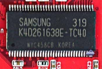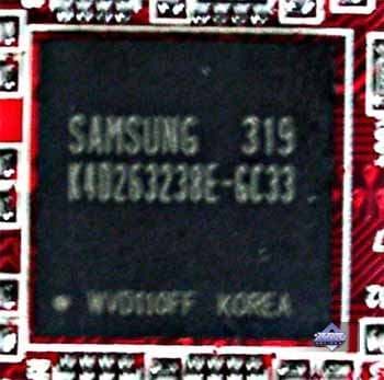 | Микросхемы памяти Samsung. Время выборки у микросхем памяти 3,3 ns, что соответствует частоте работы 300 (600) МГц, память работает именно на этой частоте. Частота работы GPU — 400 MHz. | ![]() |