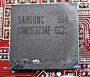 | Микросхемы памяти DDR-II производства Samsung. Время выборки у микросхем памяти 2,2 ns, что соответствует частоте работы примерно 454 (908) МГц, память же работает на частоте 350 (700) МГц. Частота работы GPU — 380 MHz. Интерфейс обмена с памятью — 256 бит. | ![]() |