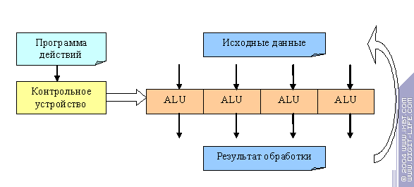 У нас есть одно контрольное устройство, которое в соответствии с программой действий настраивает набор из ALU на какие-либо операции и несколько параллельно обрабатываемых объектов, скажем вершин или пикселей. Устройство, согласно программе действий, конфигурирует ALU на выполнение некой команды, все данные параллельно за один шаг проходят через эту команду, затем устройство конфигурирует следующую команду, данные заново поступают на вход и т.д. пока программа действий себя не исчерпает (в современных ускорителях такие программы могут быть достаточно разнообразными и длинными, они и называются шейдерами, пиксельными или вершинными в зависимости от того с какими объектами работают).