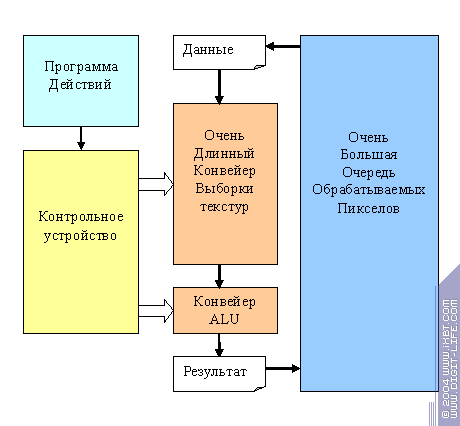 К этой схеме мы еще вернемся. А пока, для нас главным является тот момент, что именно независимость пикселов или вершин друг от друга позволяет нам эксплуатировать различные виды параллельной обработки, делая графический ускоритель столь эффективной машиной. Даже в случае относительно сложных процедур он способен каждый такт выдавать множество новых результатов.