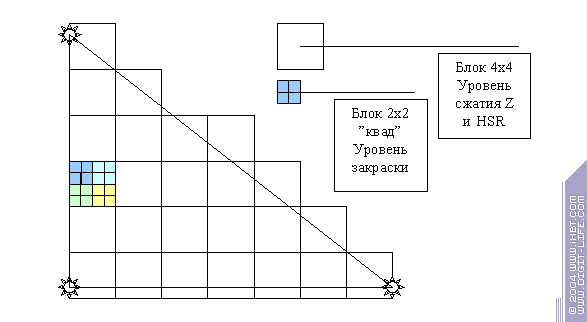 В современных ускорителях этот процесс построен в два этапа и во многом это связано с технологиями быстрой работы с буфером глубины — сжатия Z и иерархического контроля видимости. Современные ускорители, как правило, используют два уровня — блоки 4х4 (16 пикселей) — именно такими сжатыми блоками удобно хранить и сжимать в памяти Z буфер, и «квады» 2х2 — именно такими блоками происходит закраска в пиксельном процессоре. Итак: