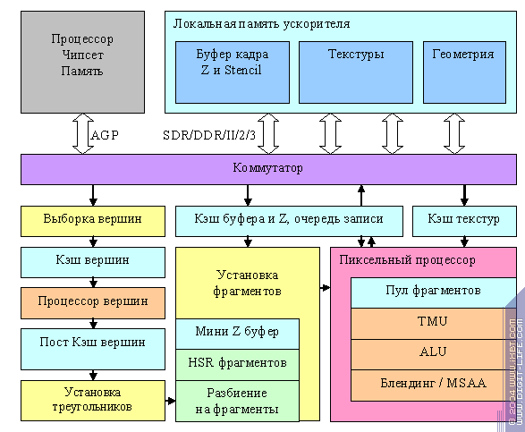 Теперь, настало время подробнее вернуться к вершинным и пиксельным процессорам, но сперва, обсудим несколько тонкостей практической реализации. Вот так выглядит блок схема современного ускорителя приближенная к его практической реализации: