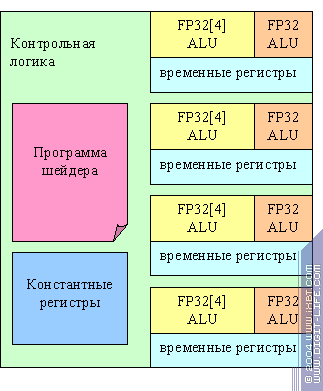 Очевидно, что для реализации вершинного процессора R3XX можно избрать схему с общей контрольной логикой, и несколькими параллельно работающими ALU, синхронно обрабатывающими несколько вершин по одной и той же программе. Нет ни динамических переходов, ни предикатов, константы не изменяются и могут быть использованы совместно. Вот так выглядит вершинный процессор старших моделей R3XX: