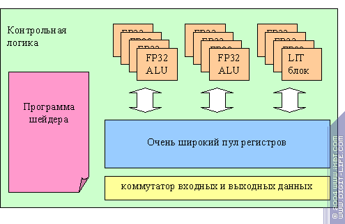 Самое приятное в этой картине то, что данных и ALU может быть сколько угодно (в разумных пределах разумеется), и поэтому мы можем спокойно растить мощь ускорителя простым клонированием ALU. Причем, контрольное устройство остается у нас одно, что сильно экономит транзисторы. Однако, в новых стандартах шейдеров DirectX (пиксельные и вершинные шейдеры 3.0) появились условия. Обработка может быть различной не только в зависимости от констант (что фактически лишь иллюзия выбора — ведь все вершины или пикселы обрабатываются одинаково), а и в зависимости от того, какие исходные данные у нас есть. Это значит что мы не можем больше разделять одно контрольное устройство на все ALU, и нам необходимо сделать действительно полноценные параллельные процессоры, которые хотя и будут руководствоваться общей программой действий, но смогут исполнять ее асинхронно, по-разному.
