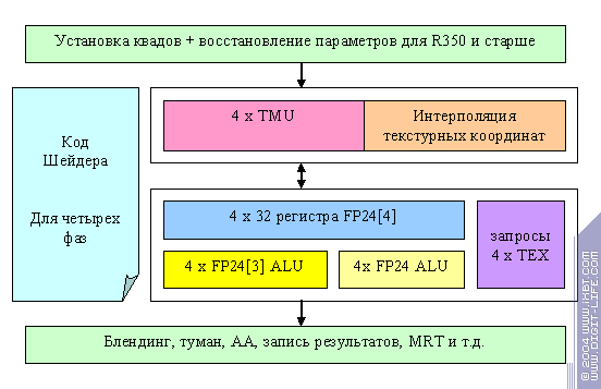 Теперь приведем предполагаемую схему пиксельного процессора R3XX. Фактически, в чипе присутствует два независимых процессора квадов, они работают асинхронно и более того, один может быть выключен (таким образом, блокировкой одного неработающего или работающего процессора квадов и получались обрезанные варианты чипа известные как 9500). Итак, один из двух процессоров R3XX:
