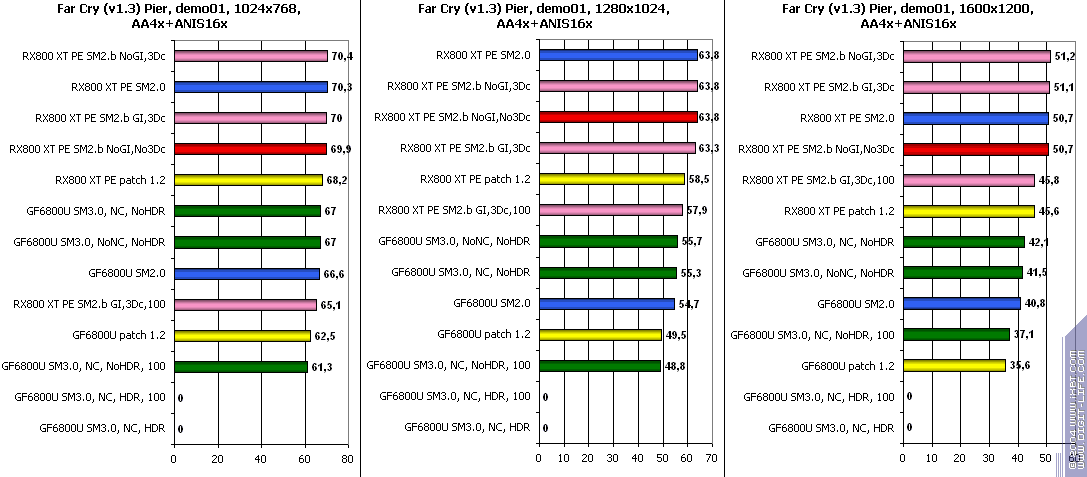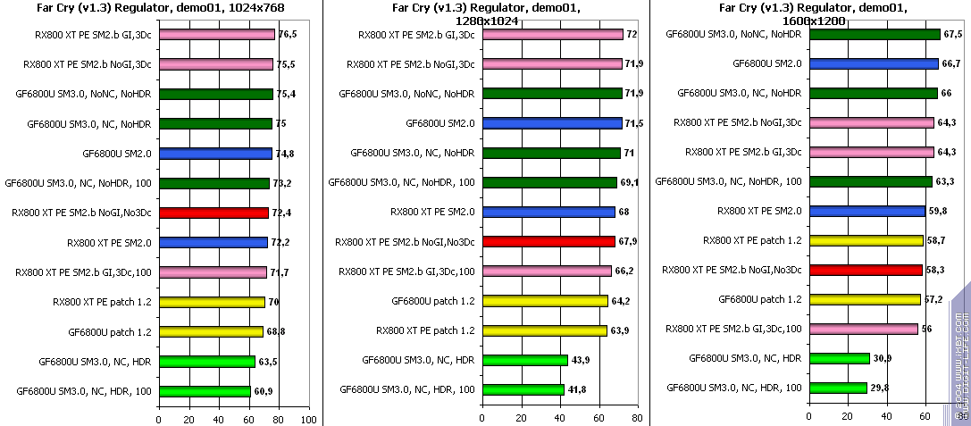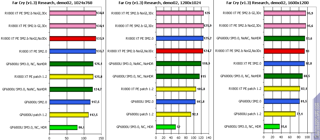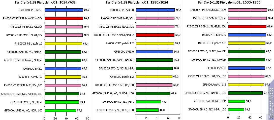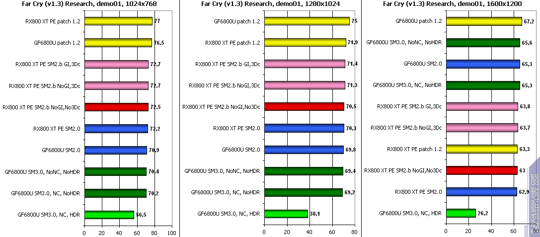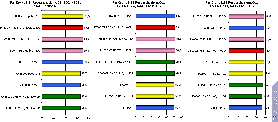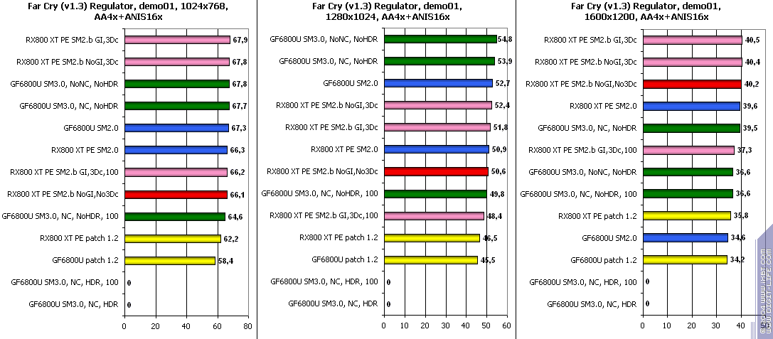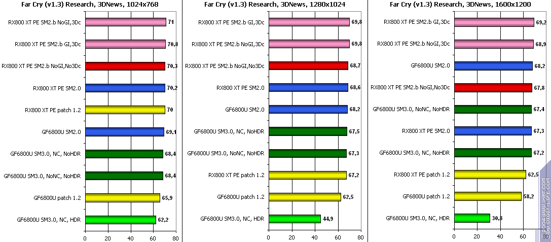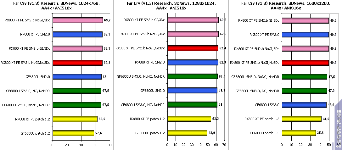 - FarCry 1.2/1.3 (Crytek/UbiSoft), DirectX 9.0c, мультитекстурирование, (запуск игры с опцией -DEVMODE), настройки тестирования все Very High. В числе используемых DEMO имеется от 3DNews.ru