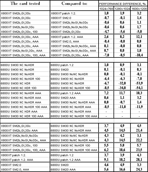 - Использование SM 3.0 против SM 2.0 у GeForce 6800 Ultra — аналогично, сложных расчетов освещения (если без HDR) тут нет, поэтому и эффекта нет.