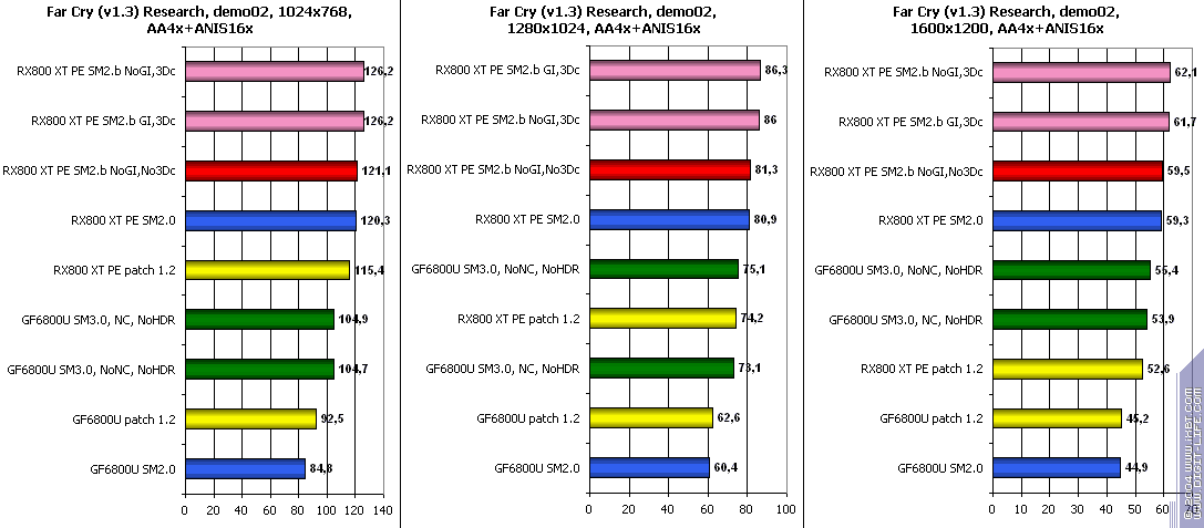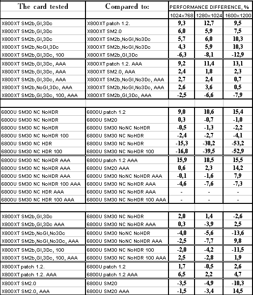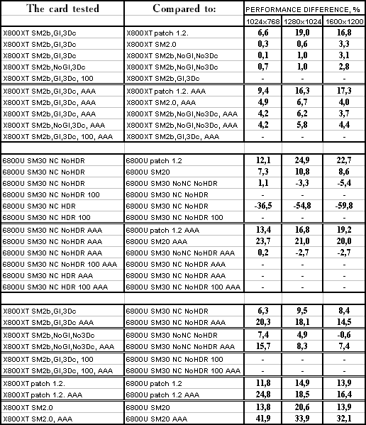 - X800 XT PE против GeForce 6800 Ultra — очевидно, что с АА+АФ продукт ATI держит уверенную победу даже если обе ускорителя используют свои возможности максимально (без HDR). А без АА+АФ все во-многом упирается в CPU и потому сравнение может быть некорректным.