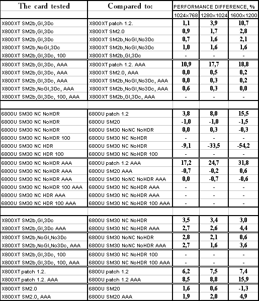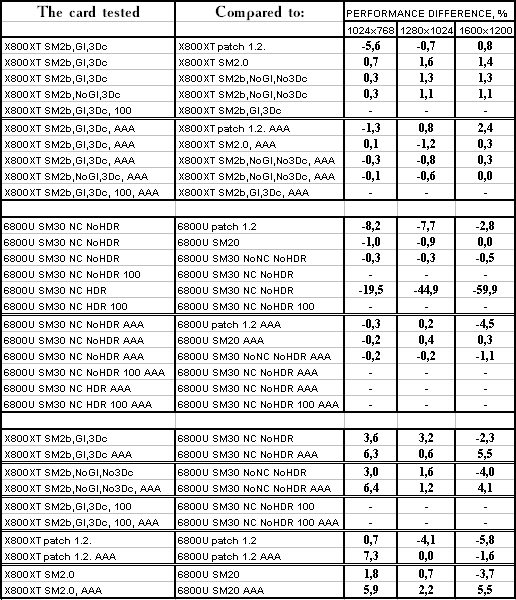 - Использование SM 2.0b против SM 2.0 у X800 XT PE — аналогично, дает прирост до 8%, но использование АА+АФ съедает эту разницу