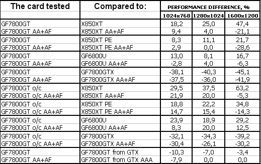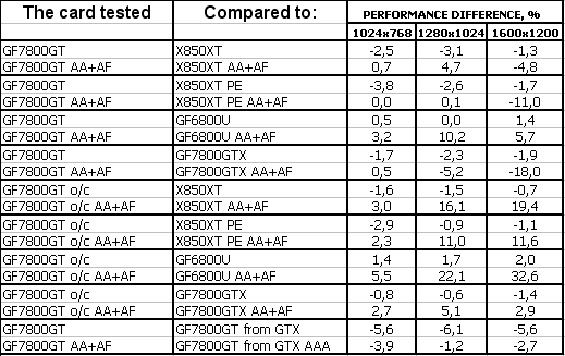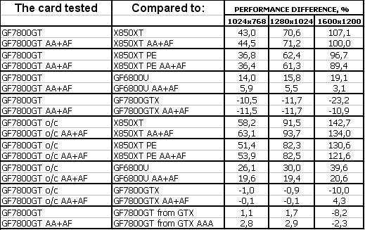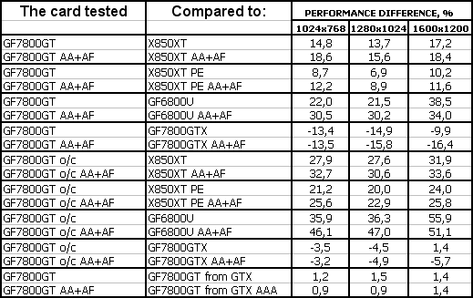 В прошлом материале по GeForce 7800 GTX от Leadtek я уже демонстрировал эмуляцию 7800GT (ведь легко при помощи RivaTuner-а уменьшить число конвейеров и снизить частоты), поэтому очень интересно будет сравнить эти результаты с теми показателями, что мы получили от настоящего 7800 GT.