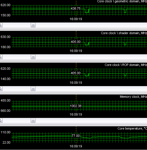 Разгон. Как известно, блоки ROP/Shader могут работать только на частотах 432,459,486,513 МГц (потенциально и выше, но вряд ли такие чипы найдутся). Только лишь блок геометрии позволяет плавно регулировать его частоту работы. Видеокарта не потянула частоту ядра в 486/486/530 МГц именно из-за первых двух блоков, поэтому стабильность при разгоне получена была только при частотах 459/459/510 МГц. По памяти предел — 1120 МГц. Таким образом, можно констатировать, что действительно на 7800GT идут отбраковки от GTX, чипы даже с 20-ю конвейерами способные на решающих блоках едва держать 460 МГц.