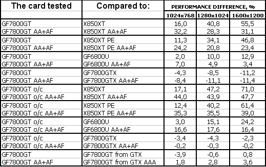 Прежде всего, стоит сказать, что эмуляция 7800GT от натурального продукта практически не отличается по производительности. Что касается соперничества с ATI, то оно очень успешное: победа даже над X850 XT PE. Разумеется, 7800 GT занял промежуточное место между 6800 Ultra и 7800 GTX. Отмечу, как очень важный фактор, что ПСП у 7800 GT меньше чем у 6800 Ultra! Поэтому в приложениях, где производительность сильно зависит от ПСП, может быть даже отставание от NV45 (хотя такие игры уже постепенно уходят в прошлое, на сцену все больше выходит игр, преимущественно нагружающих шейдерные блоки). В данном случае эта игра целиком и полностью зависит от производительности именно таких блоков, и потому мы видим сильное опережение 7800 GT против 6800 U, несмотря на более низкую ПСП.