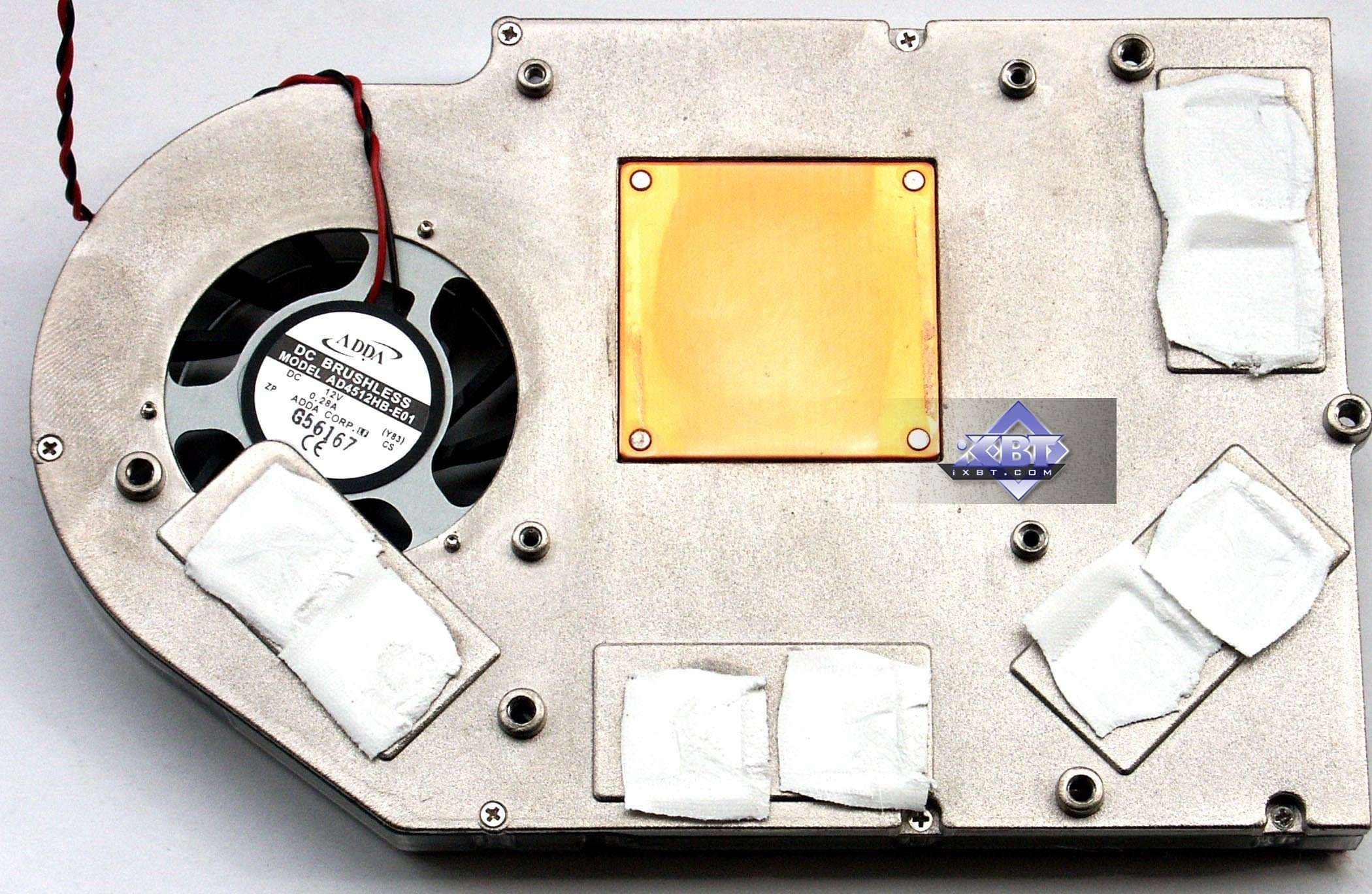 Система охлаждения была тщательно изучена в базовом материале по G70, я лишь напомню, что центральный радиатор с помощью тепловой трубки совмещен с радиатором, охлаждающим память. Далее: устройство в целом очень узкое, однослотовое, что не может не радовать. Кулер в целом очень даже тихий, только на первых секундах после запуска можно слышать небольшой шум от вращающейся на быстрых оборотах турбины. Шум можно оценить на этом ролике (1.5MB, WMV) Относительно кулера от 7800 GTX данная модель отличается уменьшенной длиной радиатора. В месте соприкосновения с кристаллом ядра установлена медная пластина. | ![]() |