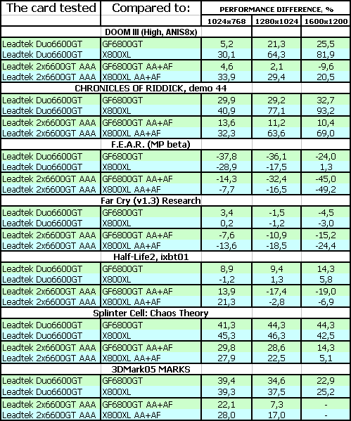 Проценты соотношений скоростей наглядно показывают, что новинка в лице 7800GT от Leadtek очень даже выгодна. При своей цене около 500 долларов она затмевает предыдущего лидера 3D-графики X850XT PE в большинстве тестов. Я уж не говорю о том, что 7800GT обладает всеми последними новациями в области трехмерных технологий (DirectX 9.0c в полную силу).