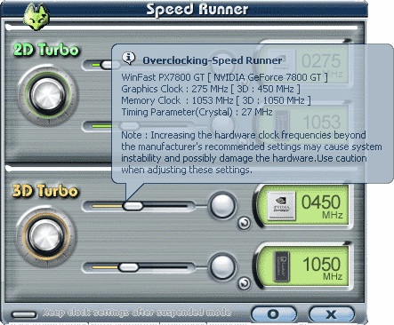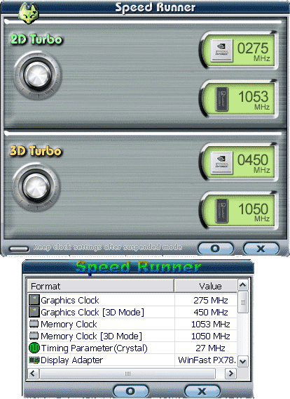 Как известно, Leadtek со своими картами поставляет их фирменную утилиту WinFox, которая не только умеет разгонять карты, но и обслуживать мониторинг состояния. Интересно отметить, что из всего набора того, что можно увидеть, на 7800GT не работает ничего, кроме температуры ядра. Утилита показывает архитектуру ядра, и… в ней точно такая же ошибка, что была в бета-версии RivaTuner — где показывается тип памяти не DDR3, а SDR. Что-то мне подсказывает, что это неслучайное совпадение, а программисты Leadtek явно использовали RT в своих целях.