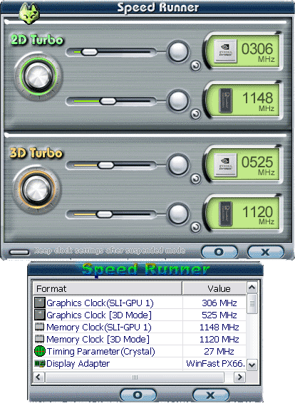 А вот что выдает WinFox по 2x6600GT. Еще раз обращаю внимание на то, что на коробке написано про частоту ядра в 550 МГц, а на деле оно всего 525 МГц.