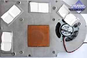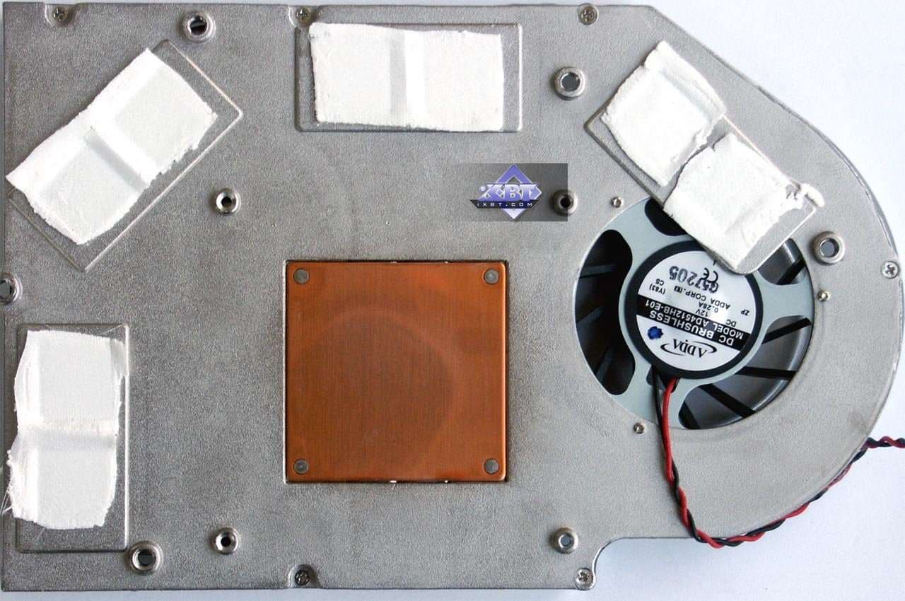 Поскольку используется кулер reference-дизайна, то я приведу описание из базового материала. Система охлаждения уникальна, до сего момента мы подобного не видели. Правда, надо сказать, что такой кулер используется не впервые, все профессиональные продукты из серии Quadro, основанные на аналоге GeForce 7800GTX (G70GL), оснащены таким устройством, поскольку там изначально частоты выше (кстати, я сам не видел этих карт, но могу предположить, что именно на Quadro ставят 512 мегабайт 1.6ns GDDR3 и используют ту же самую PCB от 7800 GTX 256MB, но уже полноценно комплектуя ее всеми микросхемами памяти). Несмотря на свои размеры и кажущуюся сложность конструкции, кулер работает просто: большой вентилятор прогоняет воздух через левый и правый радиаторы, к которым подведены тепловые трубки, несущие тепло от платформы, прижимающейся к ядру и микросхемам памяти. Прижим к последним производится через текстильные термоэлементы, пропитанные специальной пастой. Для соприкосновения с GPU имеется медная площадка с хорошо отполированной поверхностью. Не надо стараться мысленно затыкать уши, предвкушая шум такого кулера! Вентилятор вращается на частоте всего 1000 оборотов в минуту! И потому шума просто нет! Да, при старте компьютера, кулер раскручивается примерно на 4000-5000 оборотов и создает шум, но это всего на 5-6 секунд. Да и рева, как, например, у кулера от RADEON X850, нет. Система охлаждения имеет большие размеры и занимает ближайший к видеокарте слот, но, думаю, что на сегодня это уже не злободневная проблема. | ![]() |