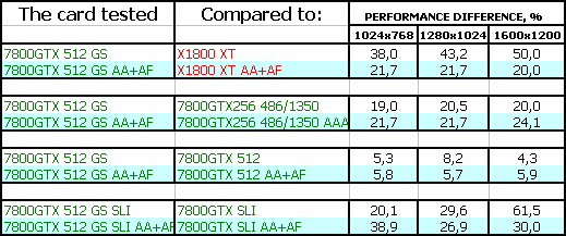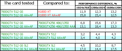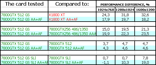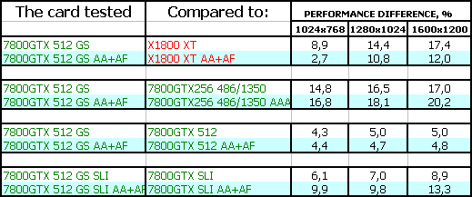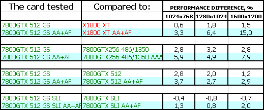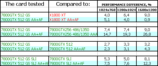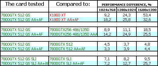 Однако у 7800 GTX 512MB есть одно явное преимущество: особо богатые пользователи могут приобрести две карты и установить их в SLI, чего пока не могут сделать потенциальные или реальные владельцы X1800 XT (мастер-карт пока нет в продаже).