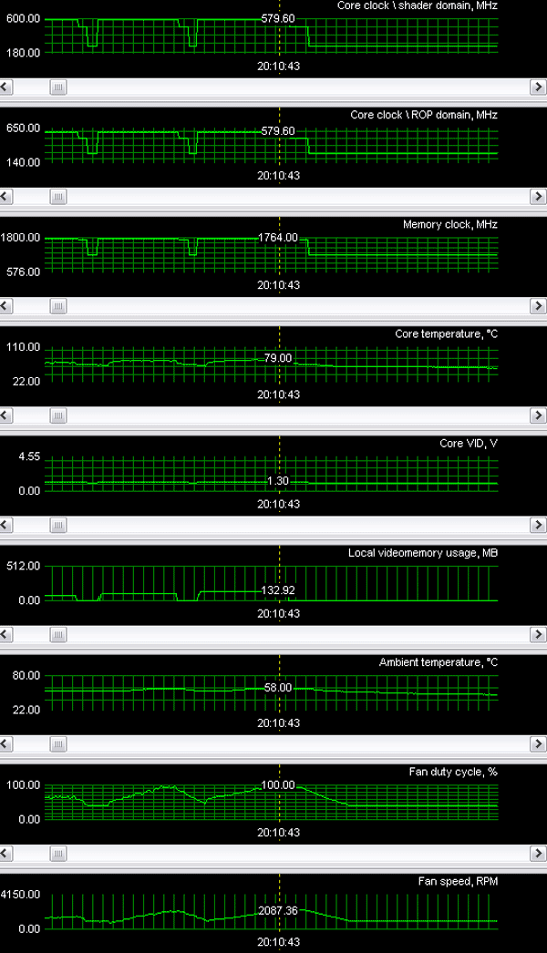 Я уже ранее отмечал, что система охлаждения у GTX 512Mb работает очень эффективно, и потому при самой большой нагрузке на штатных частотах нагрев ядра не достиг и 80 градусов (замечу, что штатные частоты для GS выше, чем у референс). Пиковая частота вращения - 100% - это 2000 оборотов. И все равно шума нет.