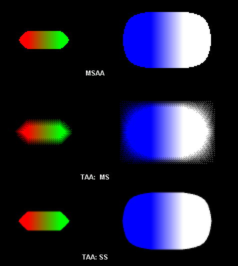 Как известно основная проблема MSAA (мультисэмплинг) состоит в том, что он сглаживает только края полигонов. Если полигон прозрачный или полупрозрачный (например, стекло, или решетка проволочного забора в игре сделанная из текстуры, в которой прозрачные пиксели чередуются с непрозрачными), то сглаживания границ с тем, что проступает через этот полигон не происходит, и мы видим четкие ступеньки. Зато нам не приходится рассчитывать значения цвета для каждого отсчета (сэмпла), и мы обходимся только раздельными значениями глубины, а цвет один общий на все сэмплы. Основную проблему - ступеньки на краях полигонов такой метод устраняет эффективно. Но с прозрачными полигонами он не справляется. Второй метод - SSAA (суперсэмплинг) честно рассчитывает все значения цвета для всех отсчетов, и мы получаем правильную картину даже через полупрозрачные полигоны с четкими границами прозрачных и непрозрачных областей. Однако, тогда мы заметно проигрываем в скорости - нам надо выполнить пиксельные шейдеры в несколько раз больше - столько сколько у нас отсчетов, 2 или 4 раза.