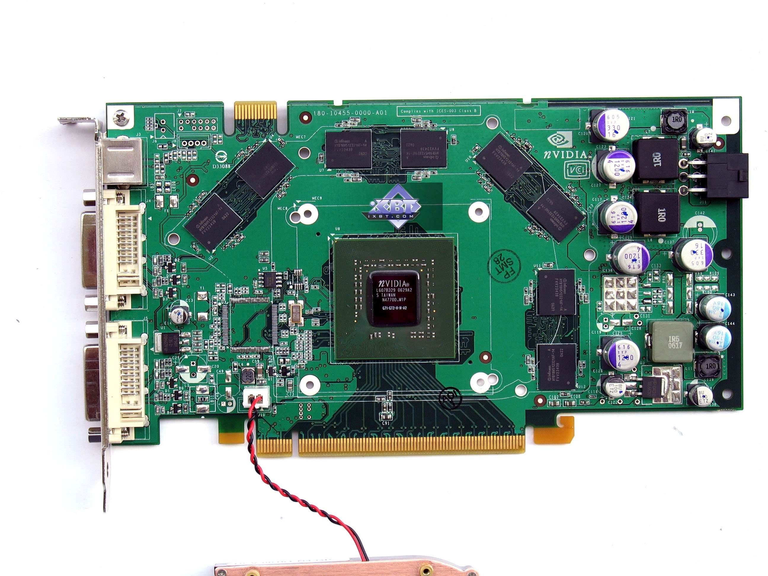 Что касается кулера на референс-карте, что продукт имеет тот же эталонный кулер, что мы видели у 7900 GT. Выполнен из медного сплава, представляет собой закрытый радиатор со смещенным относительно центра вентилятором.