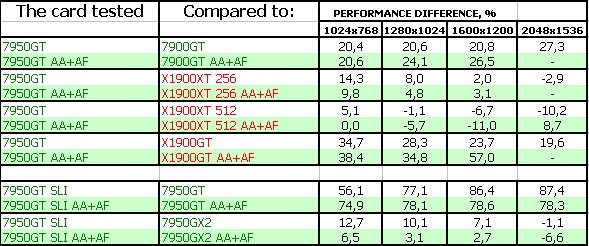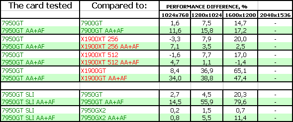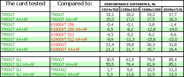Также очень тяжело оценивать 7950 GT SLI, поскольку одиночных карт ценой в 600 долларов скоро не станет (до выхода G80). Даже стоимость 7950 GX2 уже стремится вниз, и должна вскоре соответствовать уровню в 500 долларов. Но, тем не менее, анализ производительности показал, что данный тандем, разумеется, при обещанных ценах, (реально-то будет дороже на первых порах) неплохо выступает даже против 7950 GX2. Но нельзя забывать, что нужна материнская плата с поддержкой SLI, и приличный блок питания.