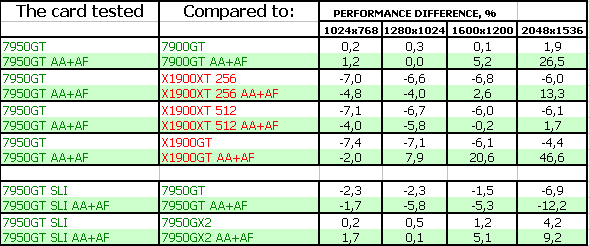 Снова хочется поругать производителей чипов за эти бессмысленные суффиксы и наименования. Уже привыкли, что 7950 означает плату-бутерброд, то есть сдвоенный 7900 GTX, работающий на более низких частотах. Теперь надо привыкать, что с той же цифрой будут выходить карты, внешне, как две капли воды, похожие на 7900 GT/GS. Если только производители эти платы не покрасят в свои цвета и как-то не выделят особо. Эталонный дизайн не отличить. И опять же: 7900GTX получается быстрее, чем 7950GT. Снова путаница для пользователей, которые не разбираются в этих суффиксах, а смотрят лишь на номер в названии. Понимаю, что маркетологи тоже хотят кушать, но все же эти все решения весьма спорны.