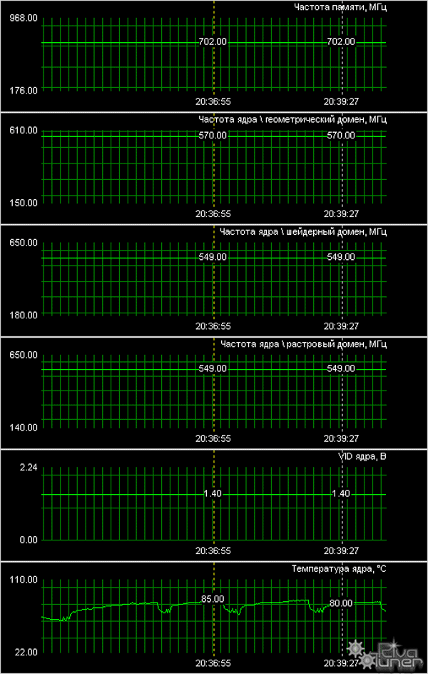 Нагрев карты по ядру - 100 градусов!!! Тестирование проводилось с помощью 3DMark06 в закрытом корпусе Chieftec, оборудованном стандартной продувкой (по 1 вентилятору на вдув и выдув). То есть, все эти надежды на бесшумность работы карты – лопнули, как мыльный пузырь. Да, я понимаю, что сама карта может работать при таком нагреве, и ей, может, ничего не сделается, но окружающие акселератор платы? Они могут перегреться, я молчу о поднимающейся от карты к процессору жаре. Меня сильно покоробили эти результаты. Повышенные частоты? Да нет, снижение до штатного уровня дало, может, пару градусов снижения температуры. Так что, очень неприятно.