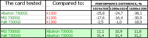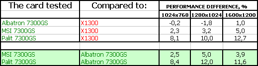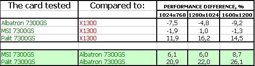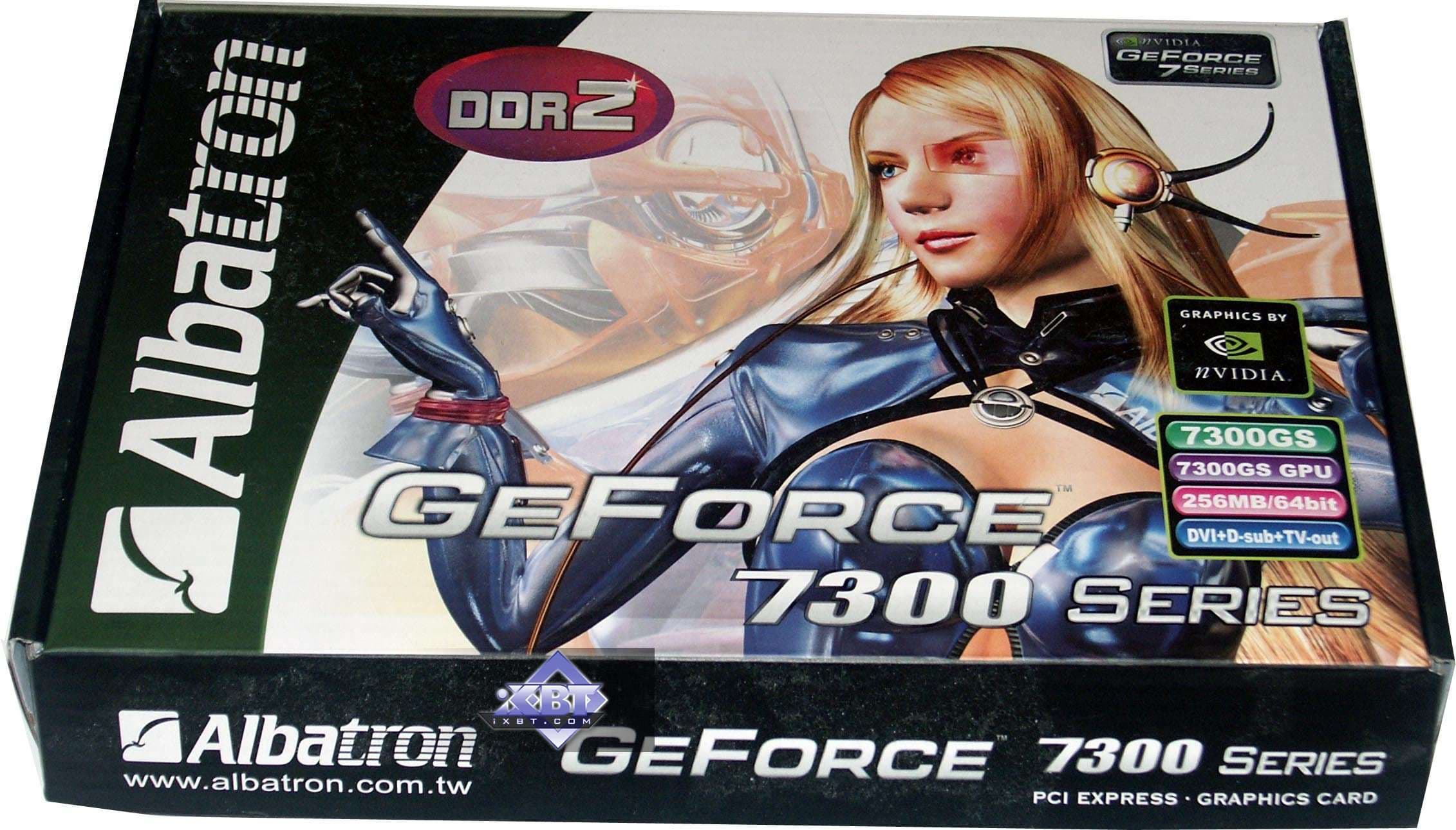 - Albatron GeForce 7300 GS 256MB PCI-E — самый дешевый из исследуемых ныне ускорителей. Хорошее качество, номинальные частоты. Поставка практически ОЕМ. Бюджетное решение для тех, кому нужен дешевый и простой ускоритель в компьютер без особых требований к 3D. Качество в 2D — хорошее вплоть до 1600х1200, 75Гц.