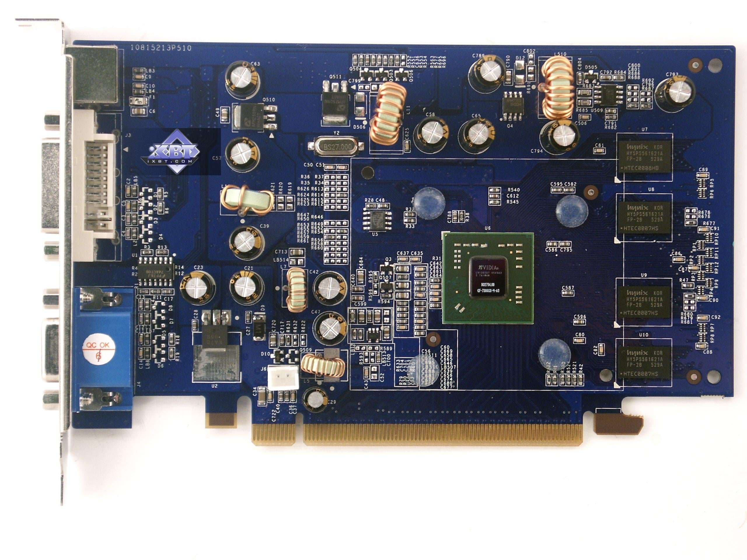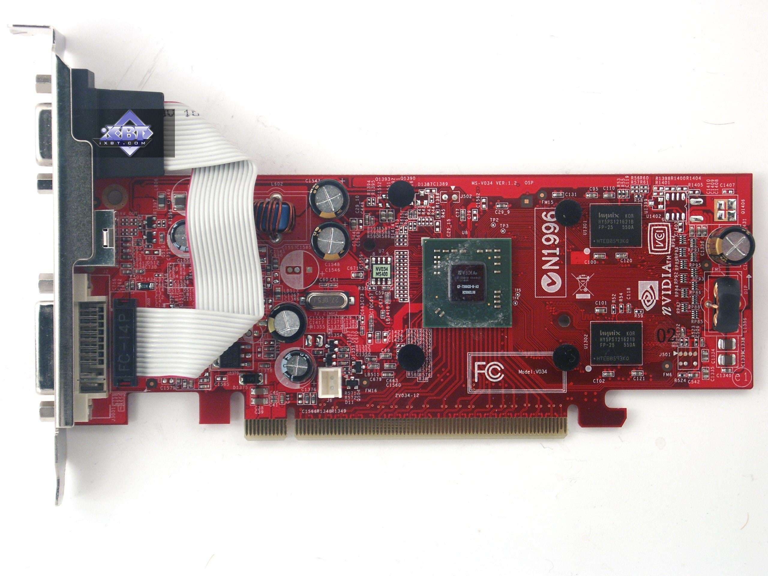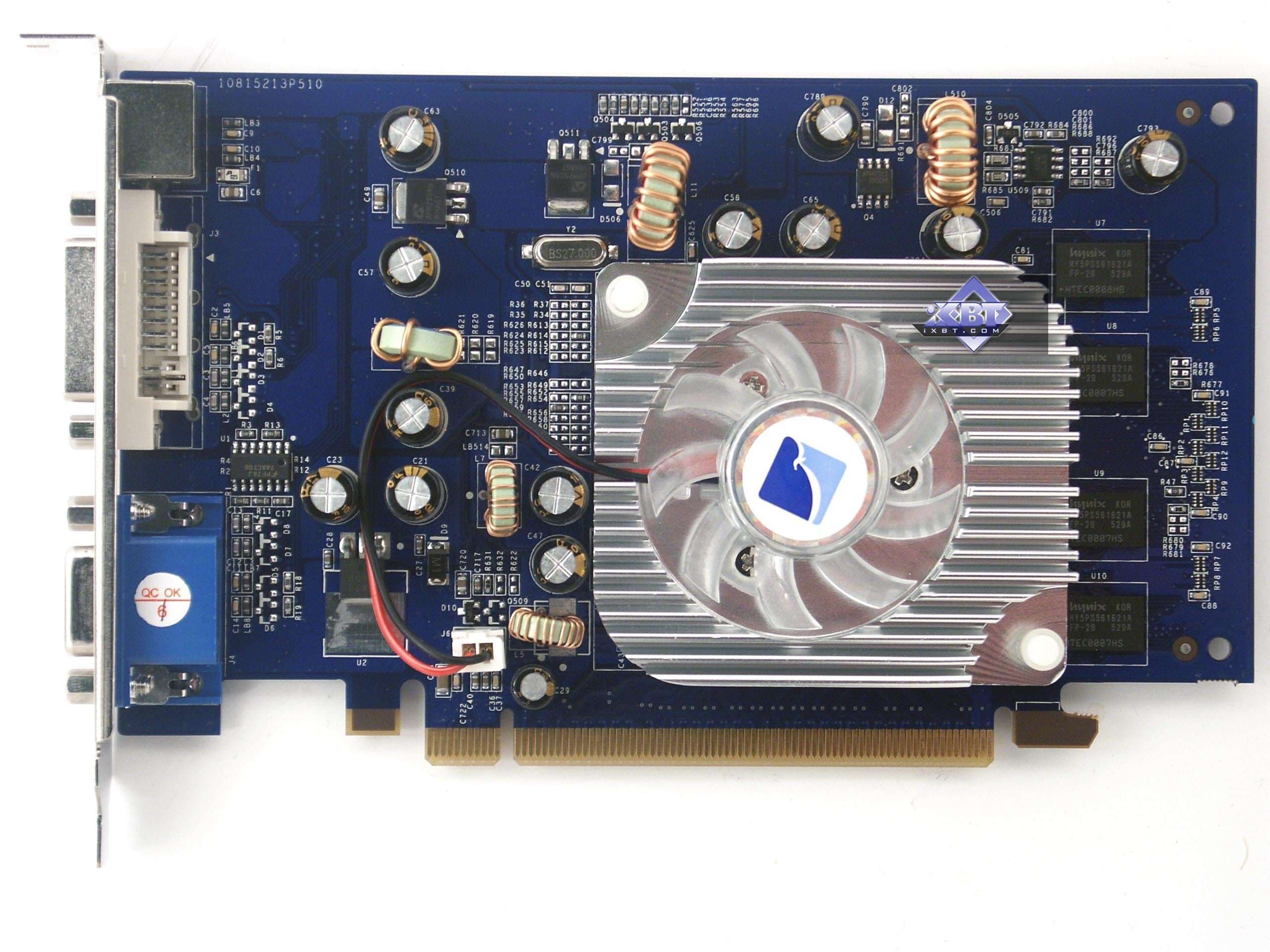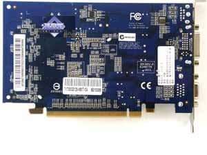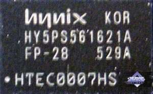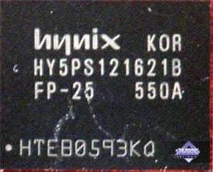 | Карта имеет 256 МБ памяти DDR2 SDRAM, размещенной в 4-х микросхемах на лицевой стороне PCB. Микросхемы памяти Hynix (DDR2). Время выборки у микросхем памяти 2.8ns, что соответствует частоте работы 350 (700) МГц. | ![]() |