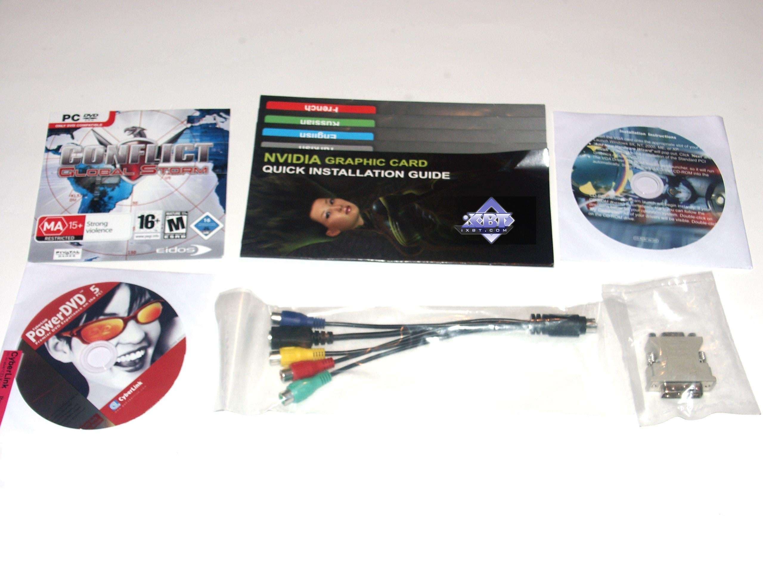 У карт имеются гнезда TV-выхода, которые уникальны по разъему, и для вывода изображения на ТВ как через S-Video, так и по RCA, требуются специальные адаптеры-переходники, поставляемые вместе с картами. Более подробно по ТВ-выходу можно прочитать — здесь.