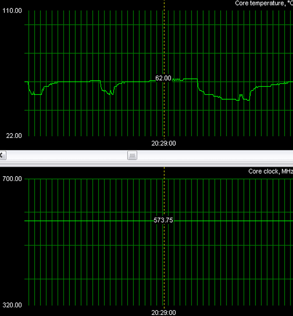 Мониторинг состояния карты (нагрев ядра) у самой быстрой (от Palit) показал следующее: