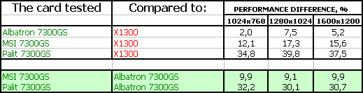 Итак, мы сравниваем 7300 GS с X1300, поскольку цены на карты примерно равны, хотя последний чуть дороже. И обратите внимание на то, что идет сравнение карты с 64-битным интерфейсом (которая явно дешевле по себестоимости) с картой со 128-битным интерфейсом. Впрочем, мы не знаем, какова себестоимость самих ядер, и потому судить очень сложно — который из конкурентов обходится дешевле в производстве.